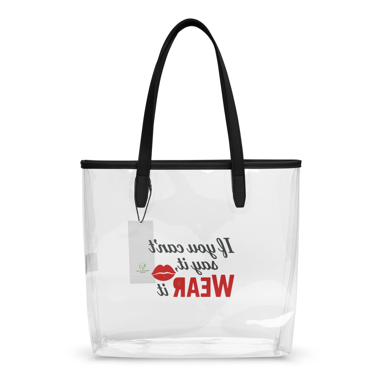 Introducing the If You Can’t Say It, WEAR It Clear Tote—perfect for those who express themselves through their outfits and let their accessories do the talking. Featuring the phrase “If you can’t say it, WEAR it,” this tote sports bold red lips that are sealed but shouting. Its transparent body with black trim and eye-catching design carries everything from groceries to your secrets. Made from clear PVC with attitude and sized to hold all your essentials, this tote doesn’t just blend in—it stands out, ready for concerts, beach trips, and everyday adventures.
