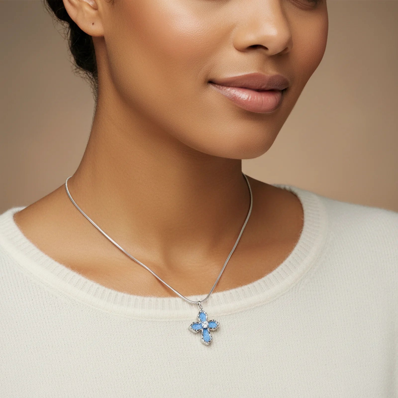 Brilliant blue cross pendant with sparkling center stone channels spiritual connection and protective energy.