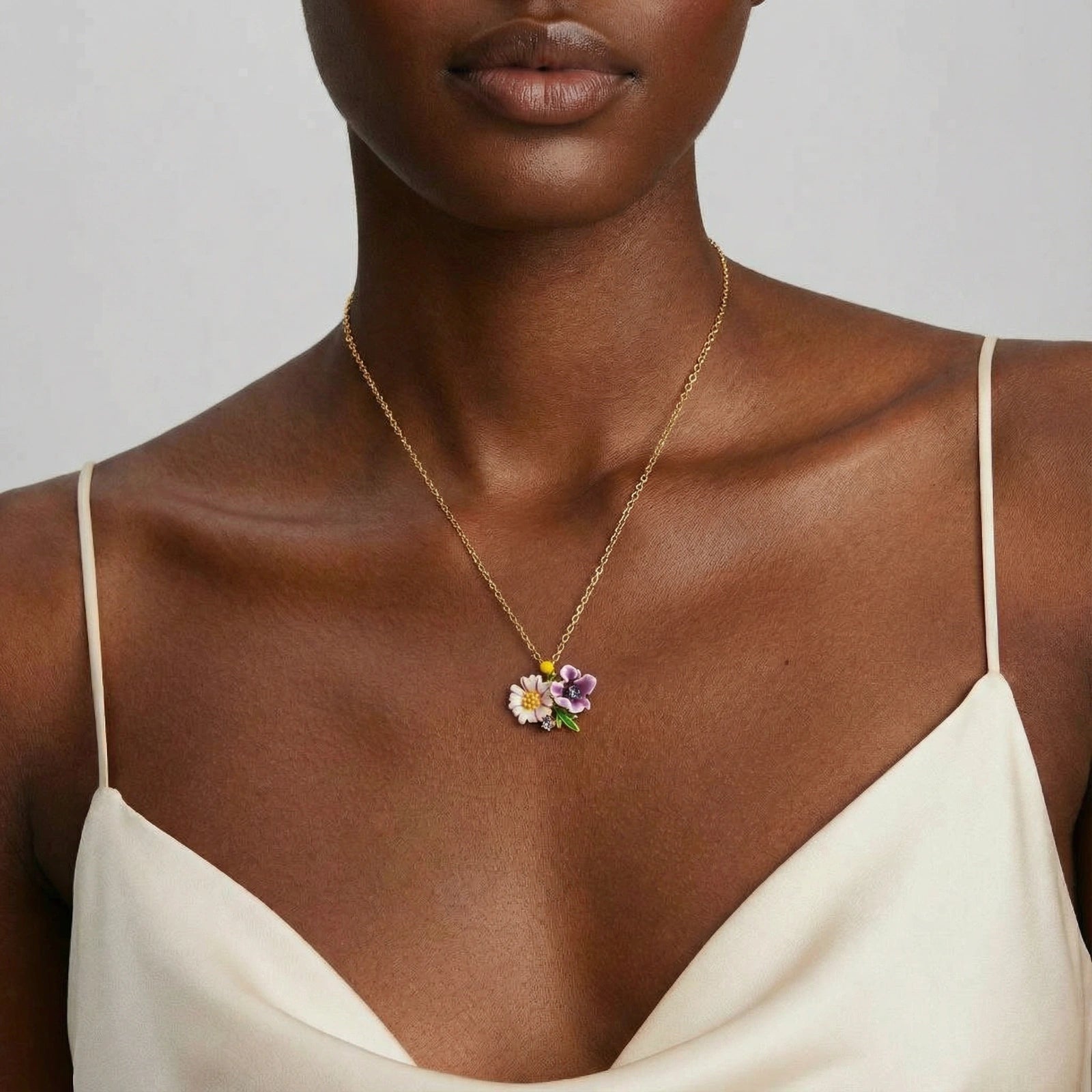 Hand-painted enamel blooms in soft pinks and purples capture that golden-hour garden energy.